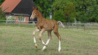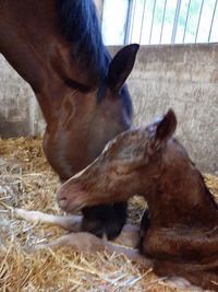 Nachdem sie im vergangenen Jahr mit Floriday eine sehr schwere erste Geburt zu bewältigen hatte, konnte sie ihren Danino nun bereits nach drei Minuten in Empfang nehmen.. Danino übertrifft unsere Erwartungen an ihr zweites Fohlen sogar noch und erfreut uns bereits jetzt mit seinem Charme und seinem anhänglichen, ehrlichen und temperamentvollen Wesen.